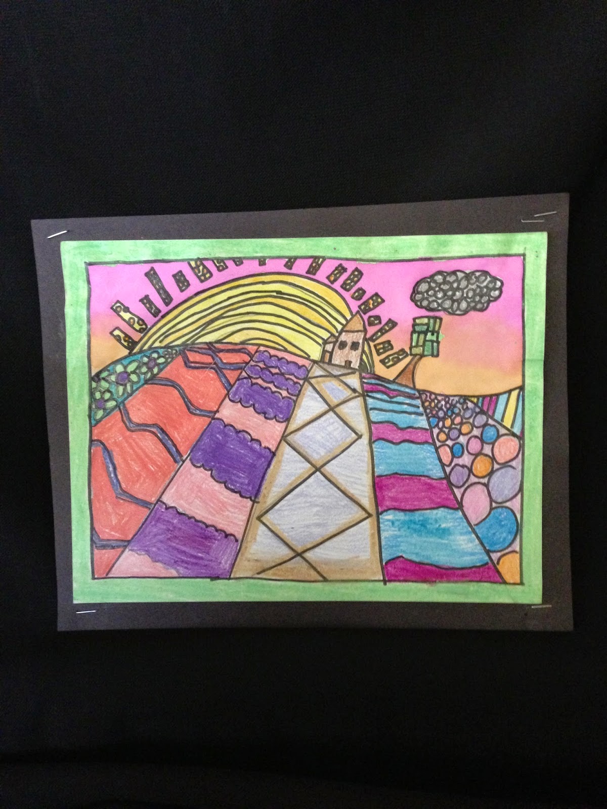 Last year's fourth graders created these lovely landscapes after learning about folk art and examining the use of pattern and color by contemporary folk artist, Heather Galler. Students focused on creating the illusion of depth and pattern. The work was created using black Sharpie, crayons and colored pencils, and the sky was created with liquid watercolor paints.